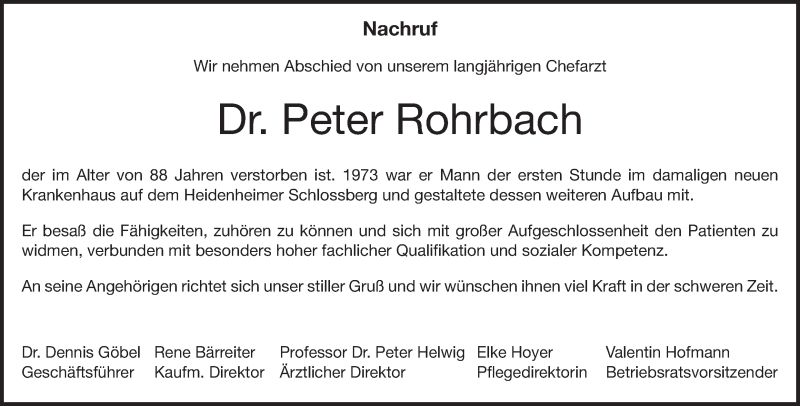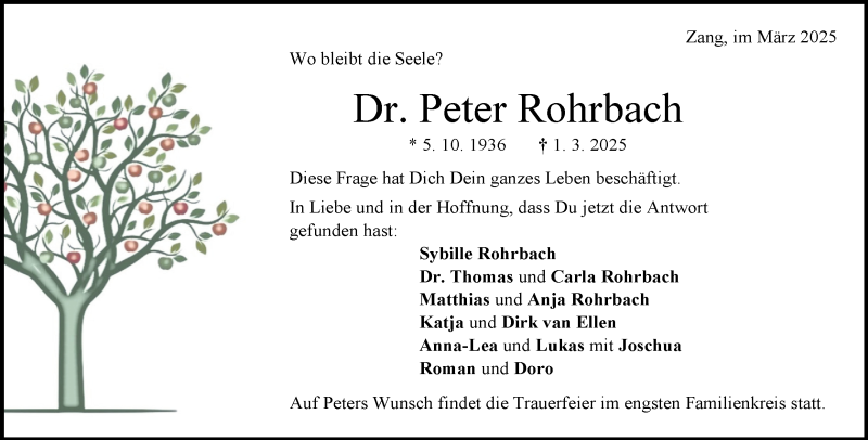 Hier finden Sie alle Traueranzeigen aus der Zeitung, die bisher für Peter Rohrbach erschienen sind. Weitere Traueranzeigen, die in der Zeitung erscheinen, werden hier ebenfalls aufgelistet