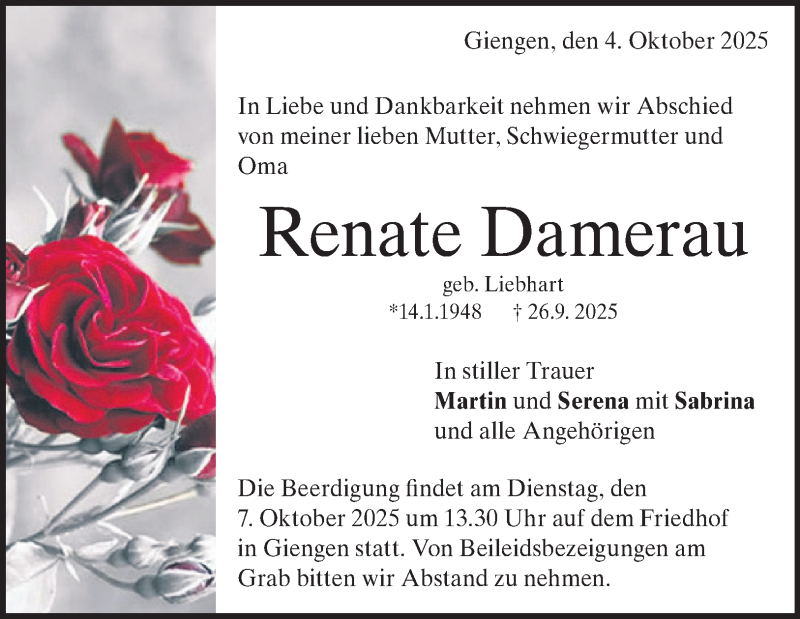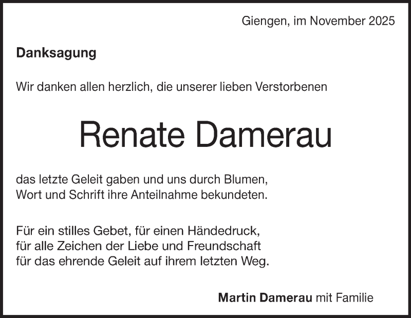 Hier finden Sie alle Traueranzeigen aus der Zeitung, die bisher für Renate Damerau erschienen sind. Weitere Traueranzeigen, die in der Zeitung erscheinen, werden hier ebenfalls aufgelistet