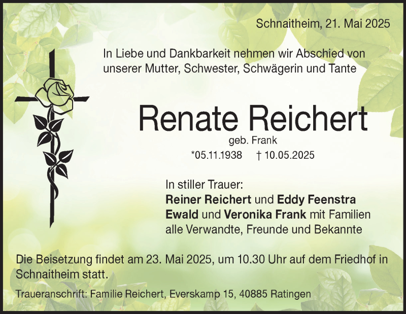 Hier finden Sie alle Traueranzeigen aus der Zeitung, die bisher für Renate Reichert erschienen sind. Weitere Traueranzeigen, die in der Zeitung erscheinen, werden hier ebenfalls aufgelistet