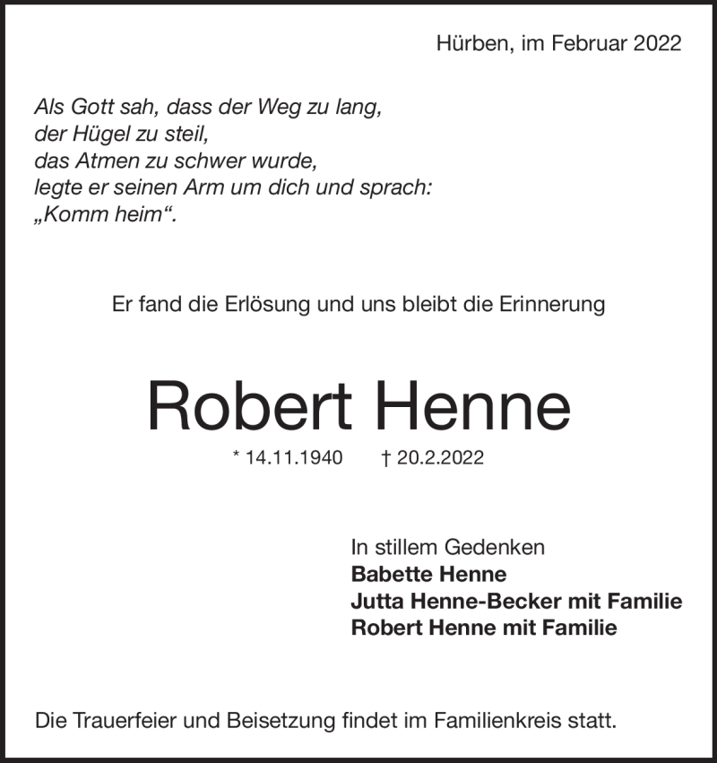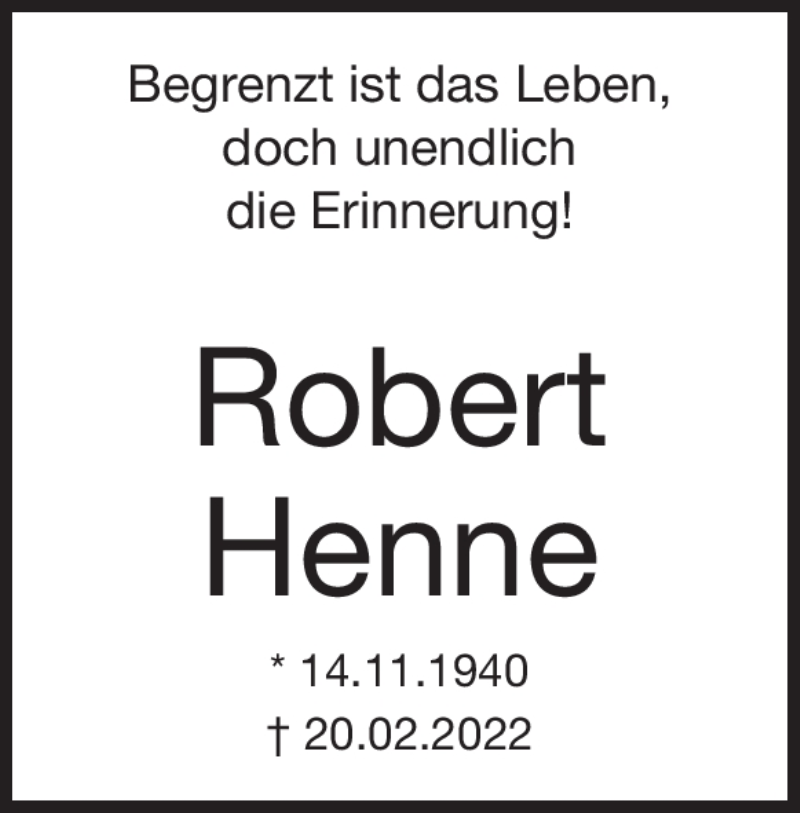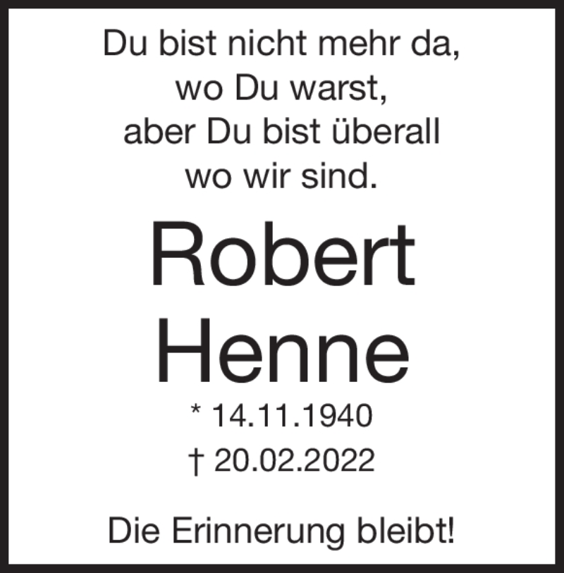 Hier finden Sie alle Traueranzeigen aus der Zeitung, die bisher für Robert Henne erschienen sind. Weitere Traueranzeigen, die in der Zeitung erscheinen, werden hier ebenfalls aufgelistet