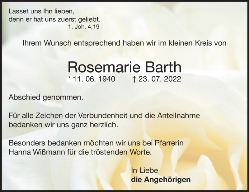 Hier finden Sie alle Traueranzeigen aus der Zeitung, die bisher für Rosemarie Barth erschienen sind. Weitere Traueranzeigen, die in der Zeitung erscheinen, werden hier ebenfalls aufgelistet