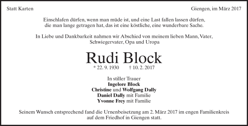 Hier finden Sie alle Traueranzeigen aus der Zeitung, die bisher für Rudi Block erschienen sind. Weitere Traueranzeigen, die in der Zeitung erscheinen, werden hier ebenfalls aufgelistet