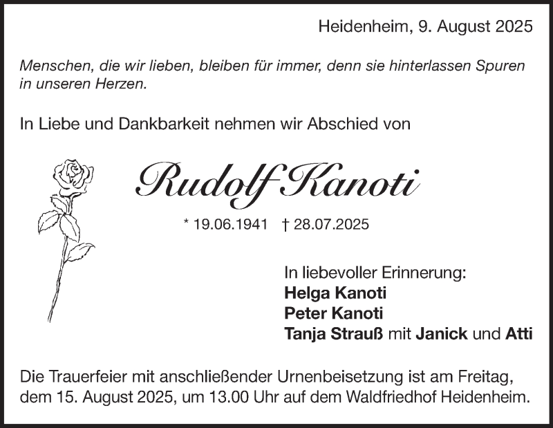 Hier finden Sie alle Traueranzeigen aus der Zeitung, die bisher für Rudolf Kanoti erschienen sind. Weitere Traueranzeigen, die in der Zeitung erscheinen, werden hier ebenfalls aufgelistet
