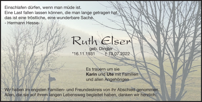 Hier finden Sie alle Traueranzeigen aus der Zeitung, die bisher für Ruth Elser erschienen sind. Weitere Traueranzeigen, die in der Zeitung erscheinen, werden hier ebenfalls aufgelistet