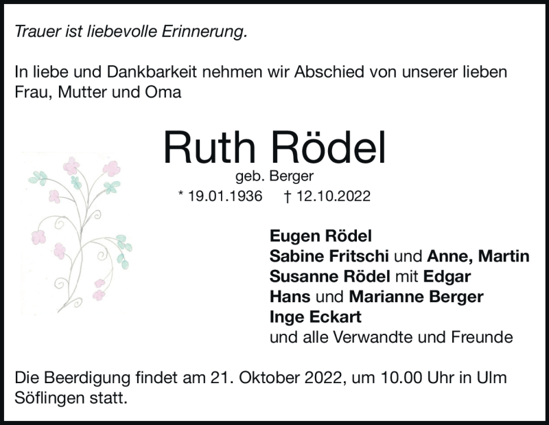 Hier finden Sie alle Traueranzeigen aus der Zeitung, die bisher für Ruth Rödel erschienen sind. Weitere Traueranzeigen, die in der Zeitung erscheinen, werden hier ebenfalls aufgelistet