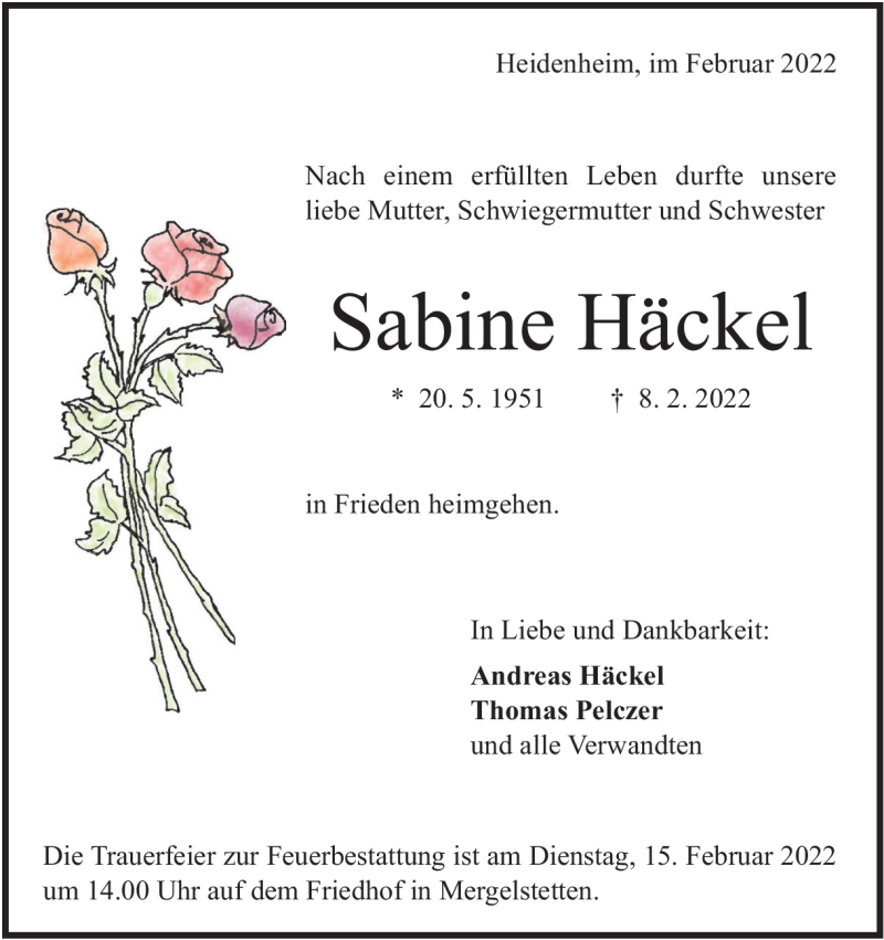 Hier finden Sie alle Traueranzeigen aus der Zeitung, die bisher für Sabine Häckel erschienen sind. Weitere Traueranzeigen, die in der Zeitung erscheinen, werden hier ebenfalls aufgelistet