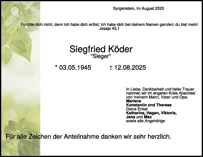 Hier finden Sie alle Traueranzeigen aus der Zeitung, die bisher für Siegfried Köder erschienen sind. Weitere Traueranzeigen, die in der Zeitung erscheinen, werden hier ebenfalls aufgelistet