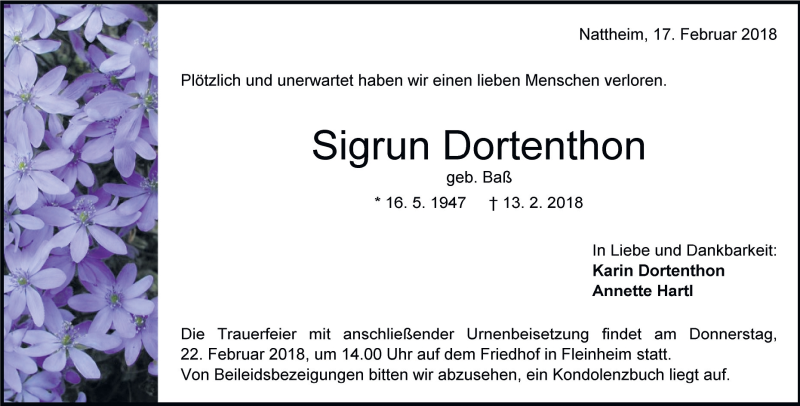 Hier finden Sie alle Traueranzeigen aus der Zeitung, die bisher für Sigrun Dortenthon erschienen sind. Weitere Traueranzeigen, die in der Zeitung erscheinen, werden hier ebenfalls aufgelistet