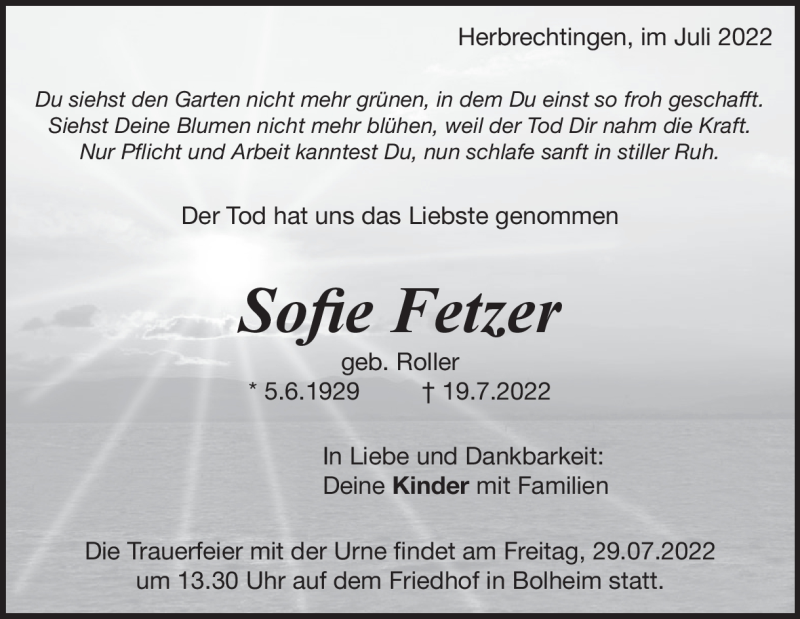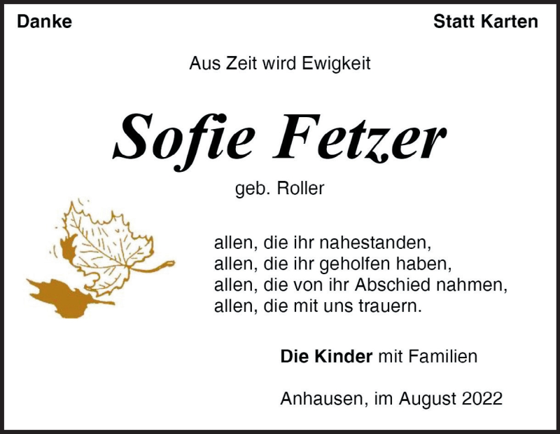 Hier finden Sie alle Traueranzeigen aus der Zeitung, die bisher für Sofie Fetzer erschienen sind. Weitere Traueranzeigen, die in der Zeitung erscheinen, werden hier ebenfalls aufgelistet