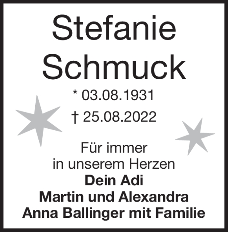 Hier finden Sie alle Traueranzeigen aus der Zeitung, die bisher für Stefanie Schmuck erschienen sind. Weitere Traueranzeigen, die in der Zeitung erscheinen, werden hier ebenfalls aufgelistet