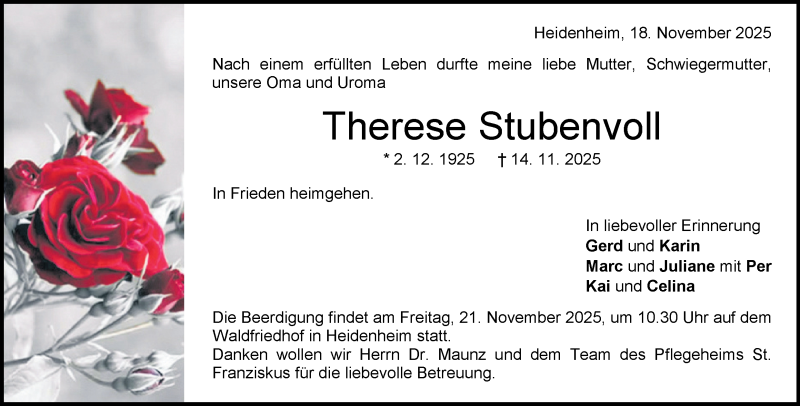 Hier finden Sie alle Traueranzeigen aus der Zeitung, die bisher für Therese Stubenvoll erschienen sind. Weitere Traueranzeigen, die in der Zeitung erscheinen, werden hier ebenfalls aufgelistet