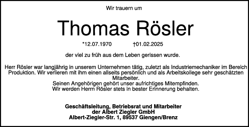 Hier finden Sie alle Traueranzeigen aus der Zeitung, die bisher für Thomas Rösler erschienen sind. Weitere Traueranzeigen, die in der Zeitung erscheinen, werden hier ebenfalls aufgelistet