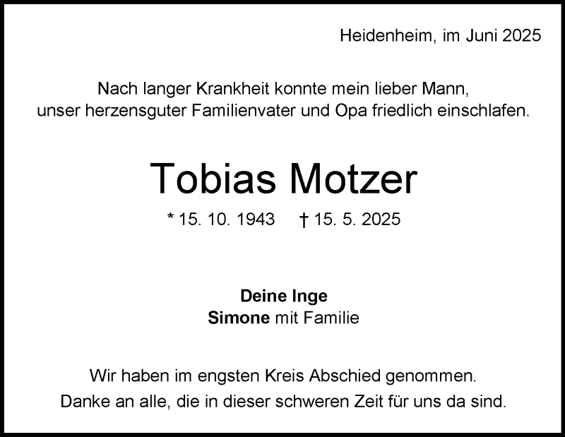 Hier finden Sie alle Traueranzeigen aus der Zeitung, die bisher für Tobias Motzer erschienen sind. Weitere Traueranzeigen, die in der Zeitung erscheinen, werden hier ebenfalls aufgelistet