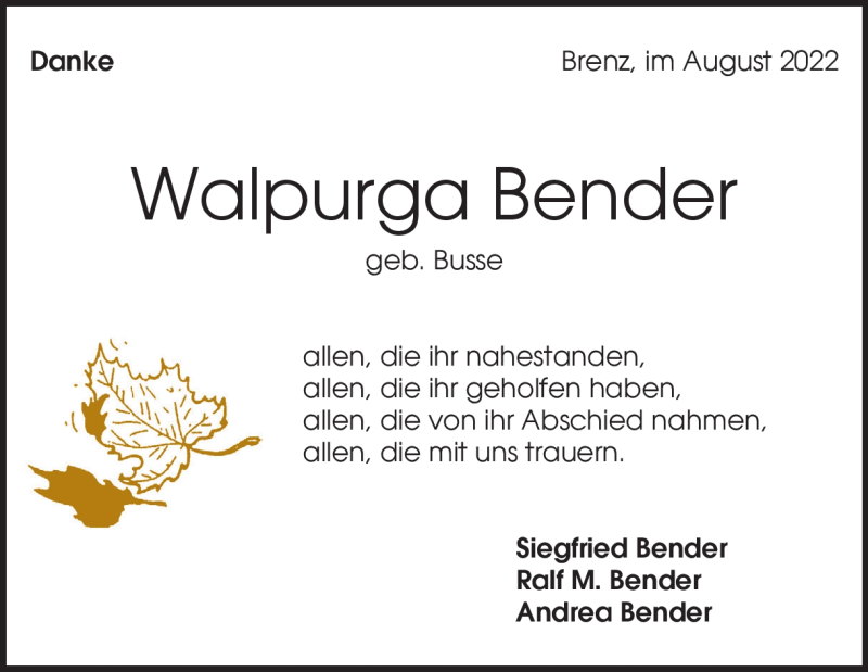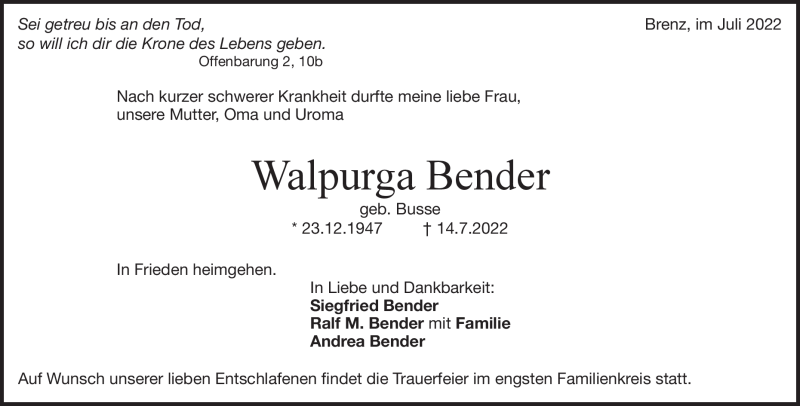 Hier finden Sie alle Traueranzeigen aus der Zeitung, die bisher für Walpurga Bender erschienen sind. Weitere Traueranzeigen, die in der Zeitung erscheinen, werden hier ebenfalls aufgelistet