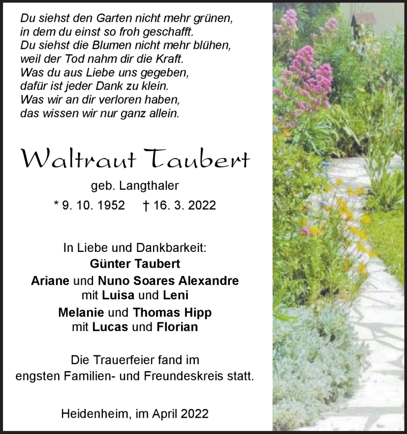 Hier finden Sie alle Traueranzeigen aus der Zeitung, die bisher für Waltraut Taubert erschienen sind. Weitere Traueranzeigen, die in der Zeitung erscheinen, werden hier ebenfalls aufgelistet