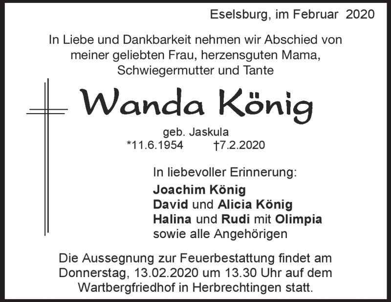 Hier finden Sie alle Traueranzeigen aus der Zeitung, die bisher für Wanda König erschienen sind. Weitere Traueranzeigen, die in der Zeitung erscheinen, werden hier ebenfalls aufgelistet