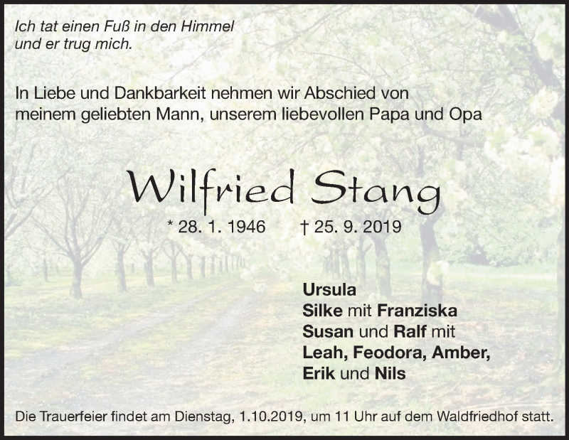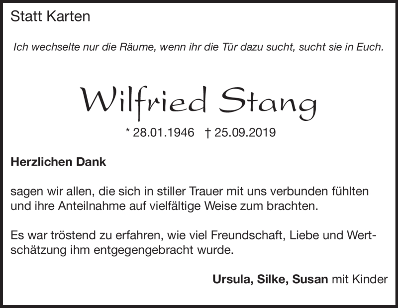 Hier finden Sie alle Traueranzeigen aus der Zeitung, die bisher für Wilfried Stang erschienen sind. Weitere Traueranzeigen, die in der Zeitung erscheinen, werden hier ebenfalls aufgelistet