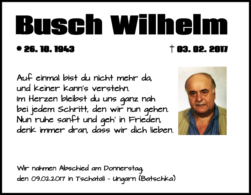 Hier finden Sie alle Traueranzeigen aus der Zeitung, die bisher für Wilhelm Busch erschienen sind. Weitere Traueranzeigen, die in der Zeitung erscheinen, werden hier ebenfalls aufgelistet