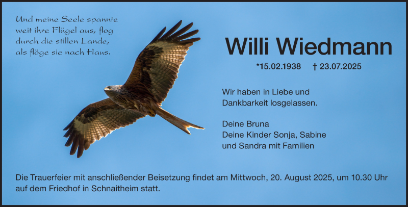 Hier finden Sie alle Traueranzeigen aus der Zeitung, die bisher für Willi Wiedmann erschienen sind. Weitere Traueranzeigen, die in der Zeitung erscheinen, werden hier ebenfalls aufgelistet