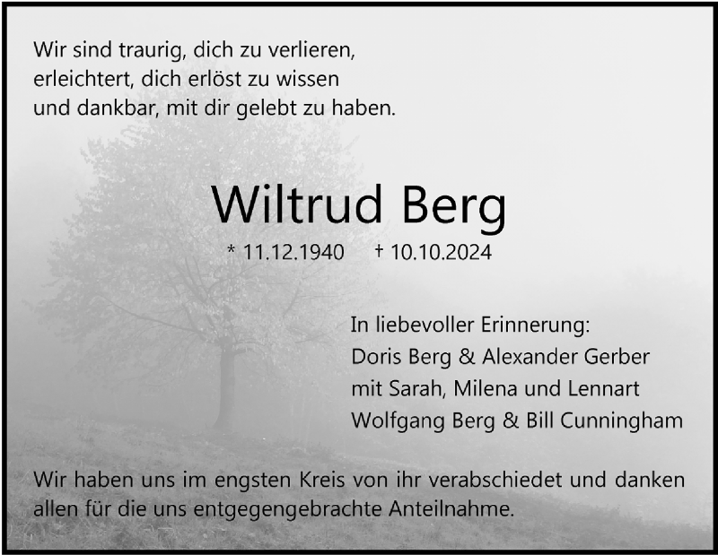 Hier finden Sie alle Traueranzeigen aus der Zeitung, die bisher für Wiltrud Berg erschienen sind. Weitere Traueranzeigen, die in der Zeitung erscheinen, werden hier ebenfalls aufgelistet