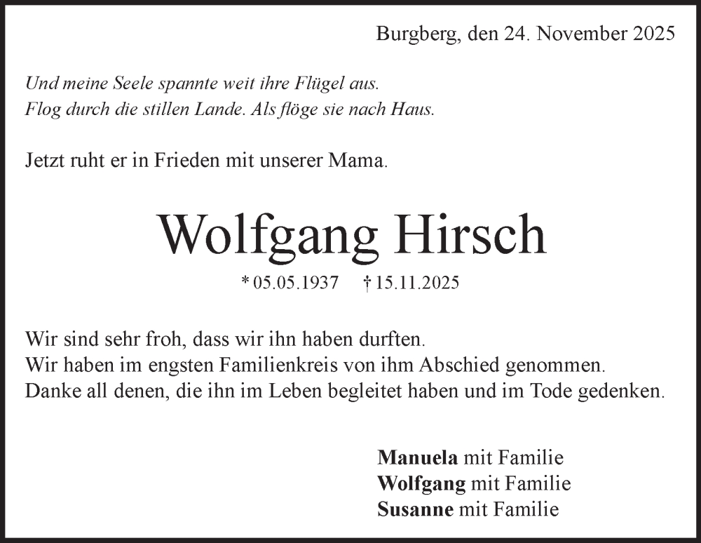 Hier finden Sie alle Traueranzeigen aus der Zeitung, die bisher für Wolfgang Hirsch erschienen sind. Weitere Traueranzeigen, die in der Zeitung erscheinen, werden hier ebenfalls aufgelistet