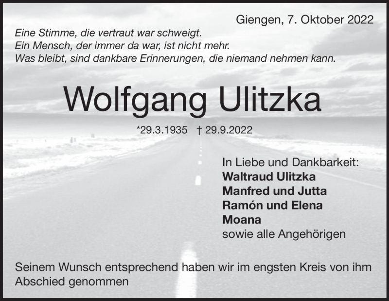Hier finden Sie alle Traueranzeigen aus der Zeitung, die bisher für Wolfgang Ulitzka erschienen sind. Weitere Traueranzeigen, die in der Zeitung erscheinen, werden hier ebenfalls aufgelistet